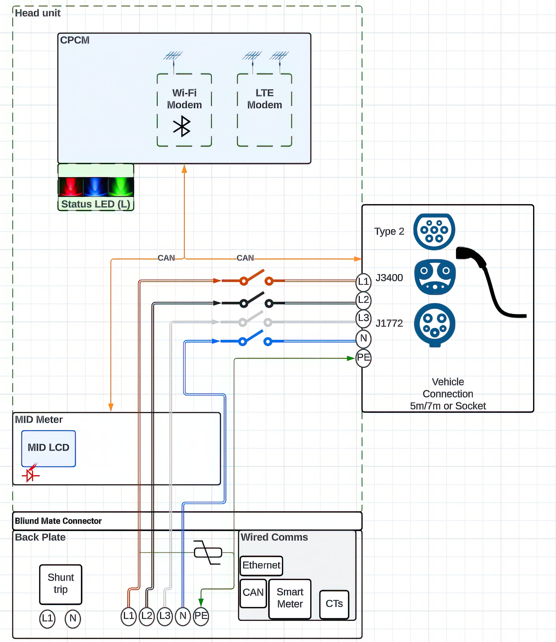 The following diagram represents a simplified description of the wiring configuration of a ChargePoint Flex Series charging station.
