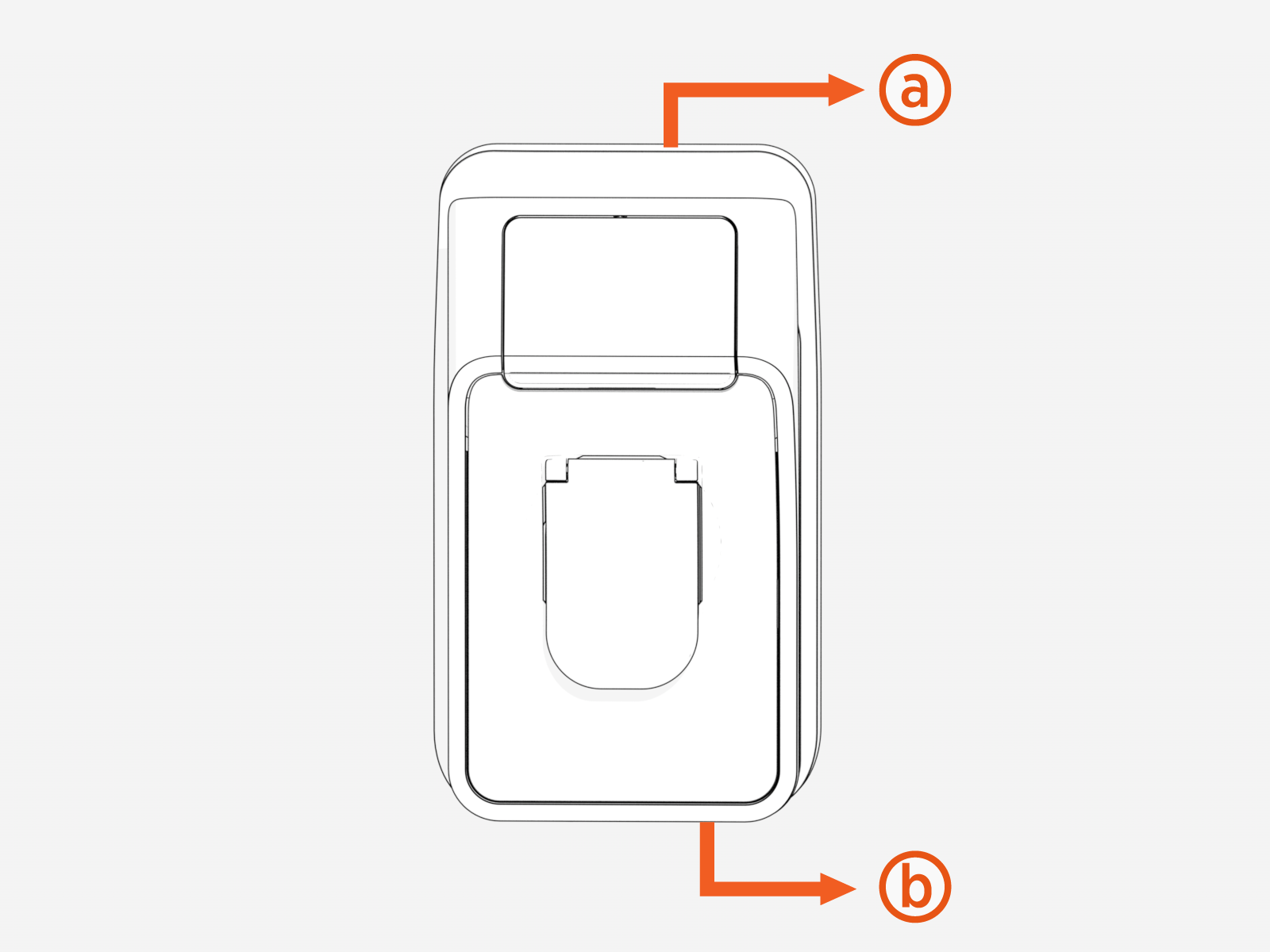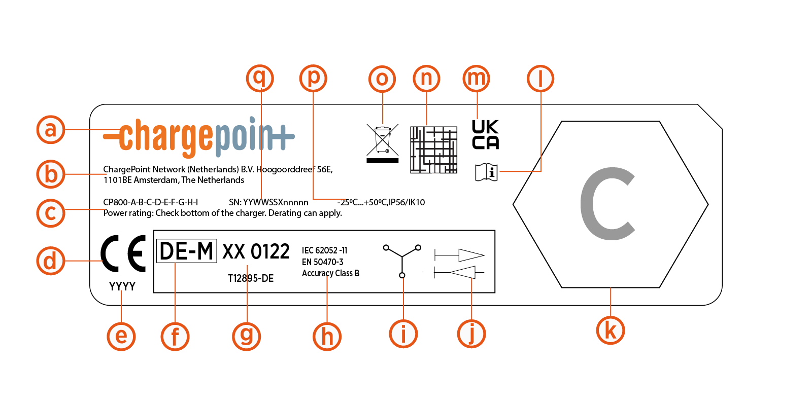 The main product label (a) including Eichrecht information is on the top of the charger. This label includes manufacturer information, metering details, and serial number information.