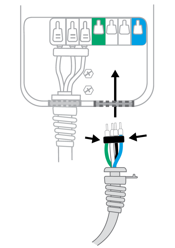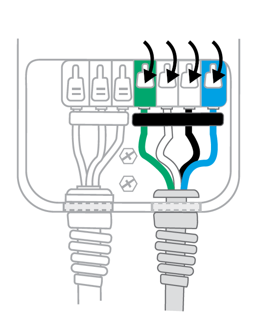 • Insert the exposed wires into the corresponding holes, pushing the cables up until the silver conductors are no longer visible.