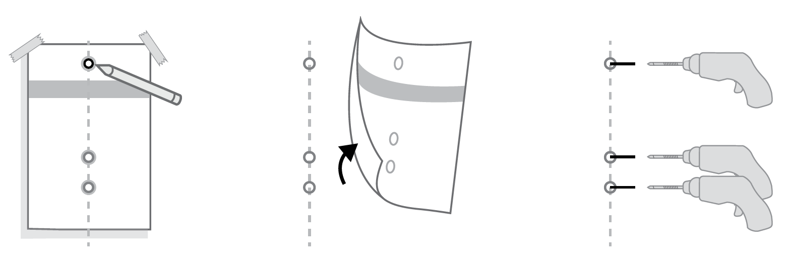 • Line up the lower mounting holes with the marks you made and tape the installation template against the wall.