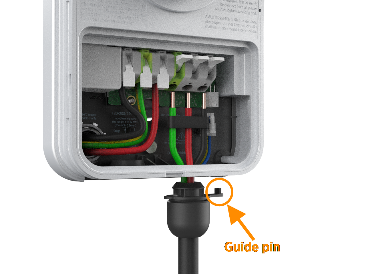 Ensure that the guide pin on the cable collar goes into the corresponding hole on the bottom of the enclosure.