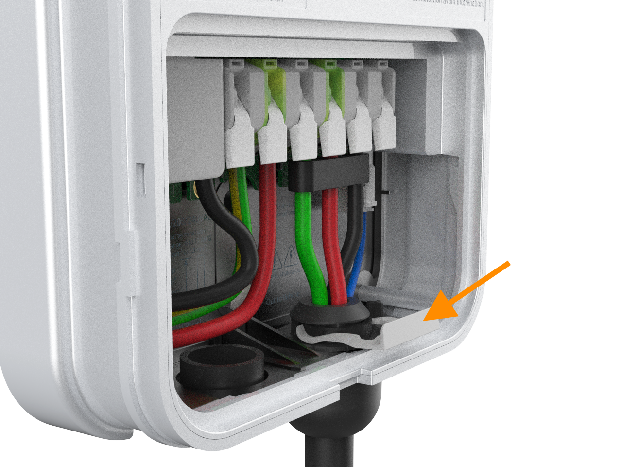 Remove the cable clip from the cable. Squeeze the wires and black wire harness and, along with the 4-pin connector, insert them into the opening on the lower right side of the station, pushing up until the cable collar is flush against the enclosure.