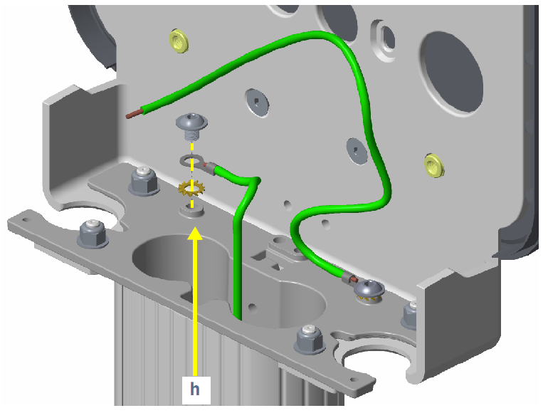 Using a driver with a 5 mm hex bit, a 10 mm M8 button head screw, and a toothed washer, connect the preinstalled grounding cable inside the pedestal column to the head bracket (h). Tighten the screw to 16 Nm.