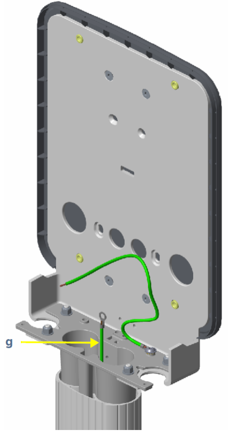 Find the preinstalled grounding cable inside the top of the pedestal column (g). Lift the station mounting bracket and carefully guide that grounding cable and the power cables through the opening in the bottom of the head bracket.