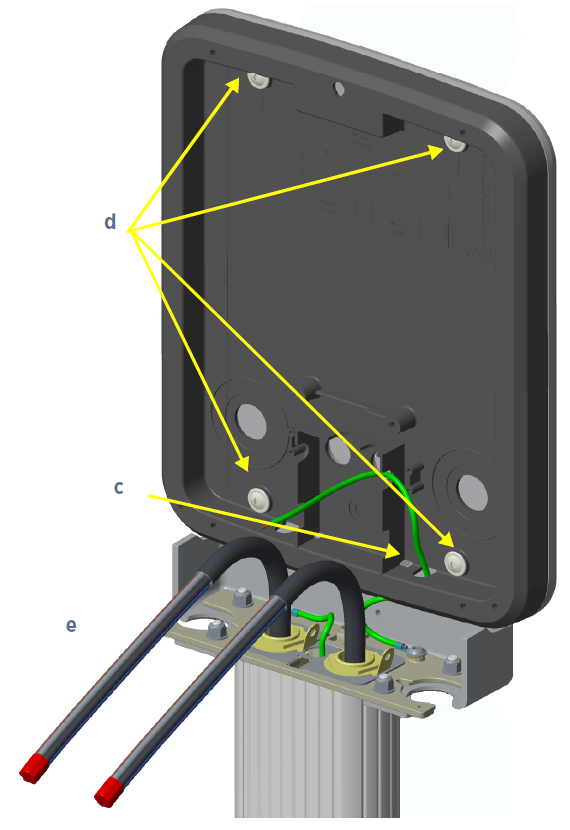 Using four 14 mm M8 socket head screws, secure the grounding plate to the station mounting bracket (d). Tighten the screws to 16.5 Nm.