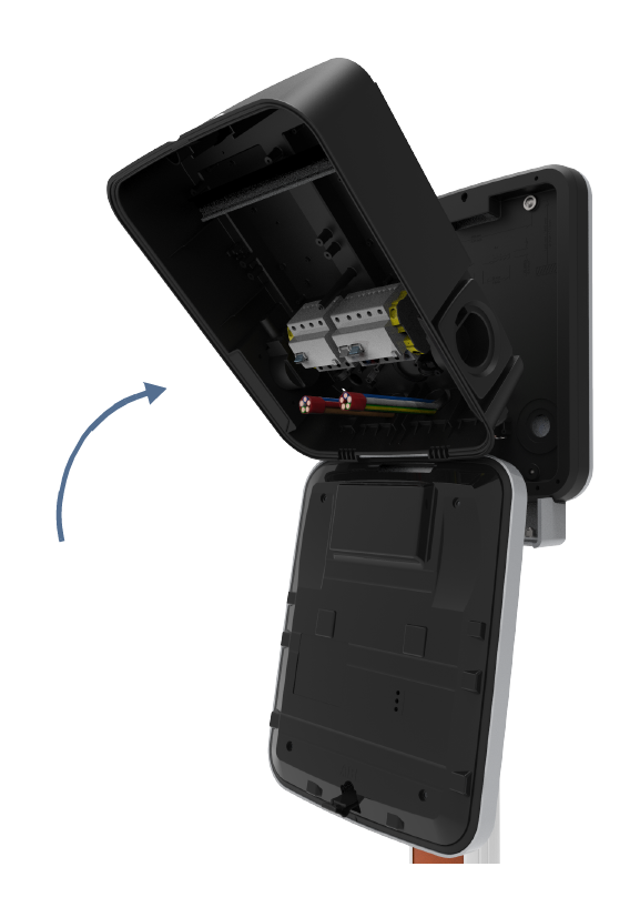 Carefully swing the door open to more easily guide the power cables into place.