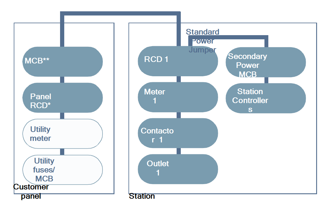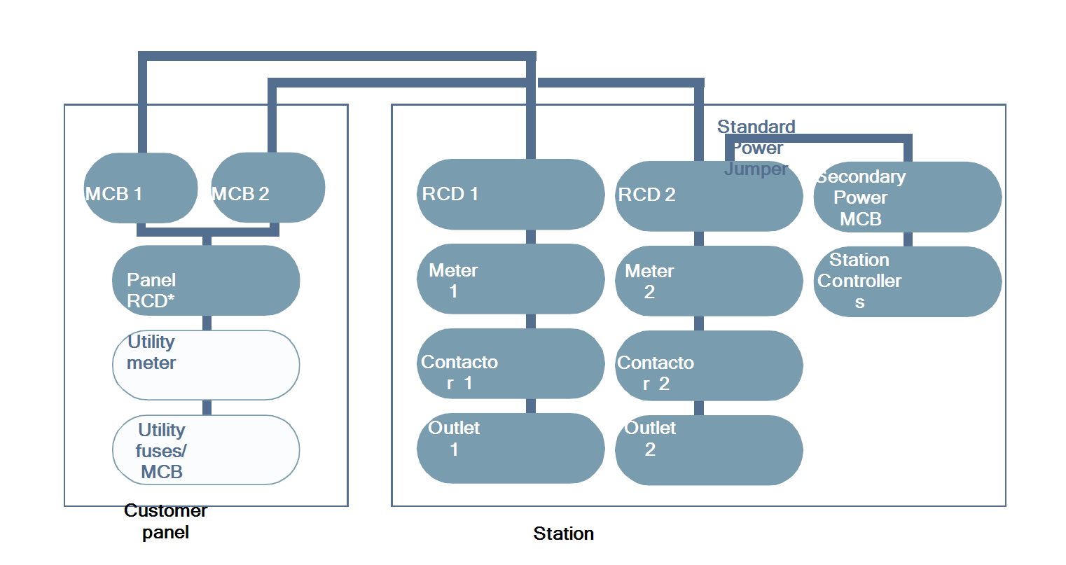 To power a dual-port station using a single power cable, use the Cable Share Jumper. The L1 to L1 Cable Share Jumper is included with the CP4000. The L1 to L2 Cable Share Jumper is an alternative and is sold separately. Circuit sharing is available only for dual-port station configurations.