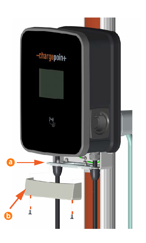 Align the trim wall (b) so that it covers the bottom of the charging station and station mounting bracket. Use a T27 Torx driver and two M6 screws to secure the trim wall in place. Torque the screws to 6.5 Nm.