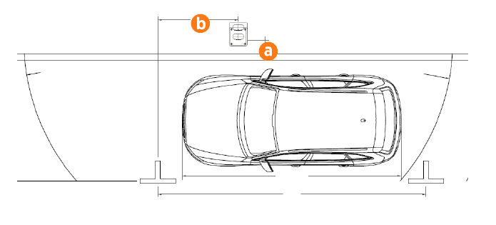 Place a single port station for a single parallel parking space 6 m long. Place the station (a) 450 mm from the curb, and 1.8 m from the front of the parking space (b). The arc shows the usable reach of the charging cable for cable-attached stations (b). This can be used to estimate reach for shuttered sockets as well.