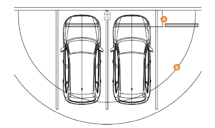 For wall mounted stations, the wall must be smooth, stable, plumb and sturdy. The minimum height of the wall must be 1250 mm. Place wheel stops (a) 900 mm from the wall. The arc shows the usable reach of the charging cable for cable-attached stations (b). This can be used to estimate reach for shuttered sockets as well.