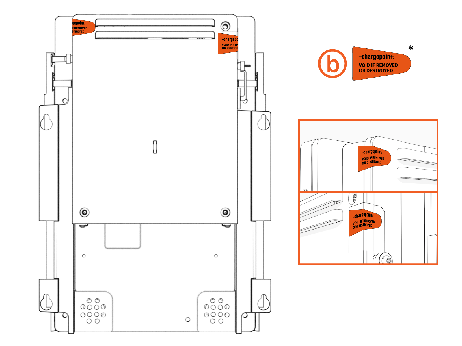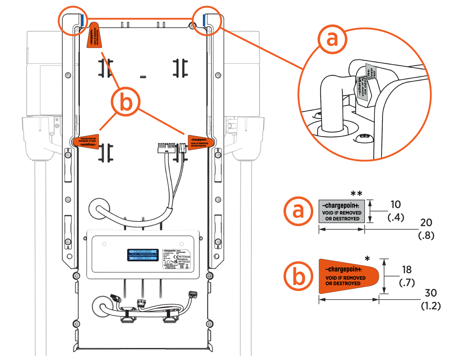Components of the CP6000 have self destructive tamper proof labels applied by the manufacturer in several locations (a) and (b). Components of the CP6000 also have self destructive tamper proof labels applied by users in some locations (c) (optional).