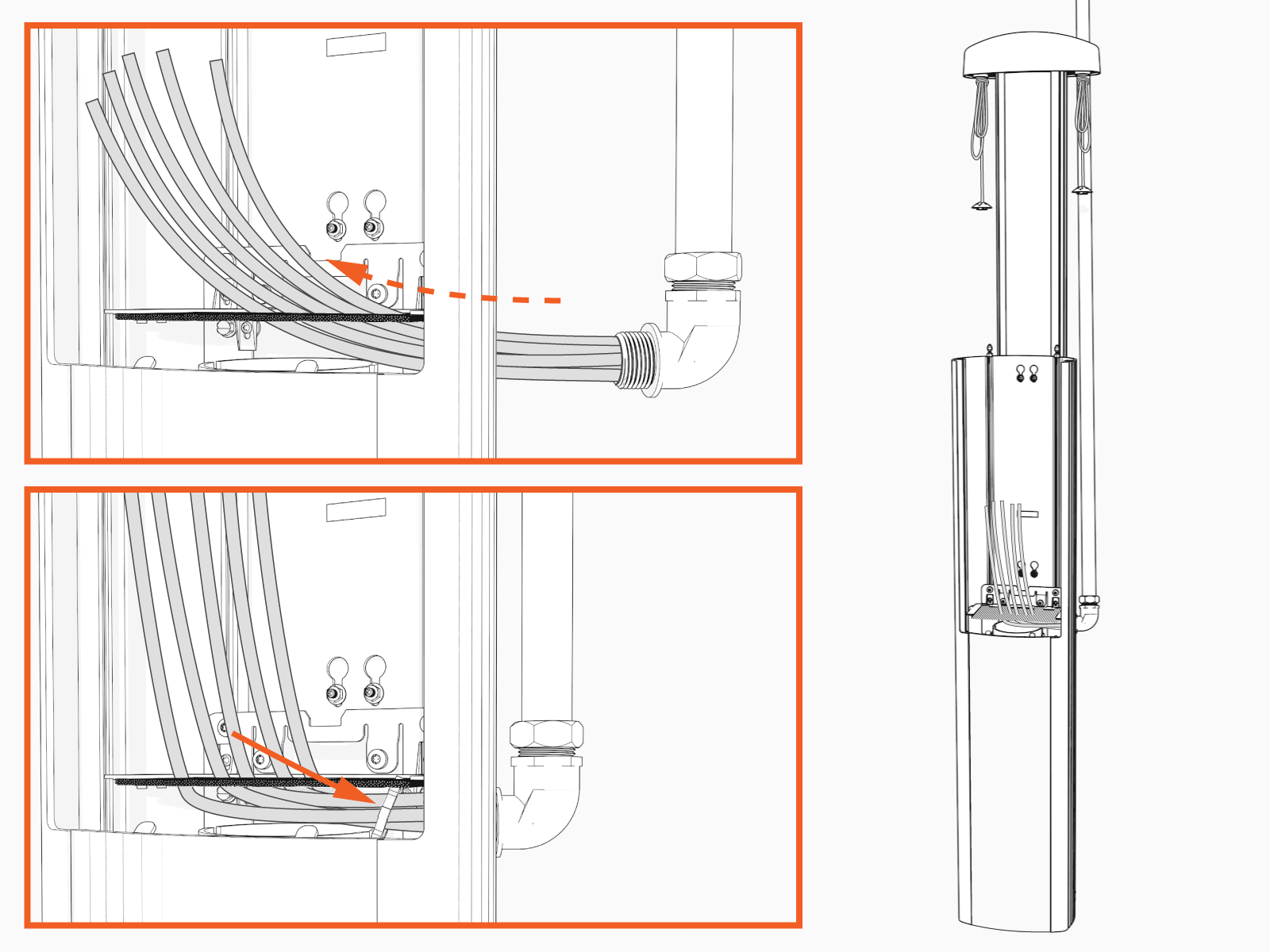 If the conduit cannot come from below the pedestal (existing concrete in a parking garage, for example), mount the pedestal and ensure it is level and tight, then follow these steps.