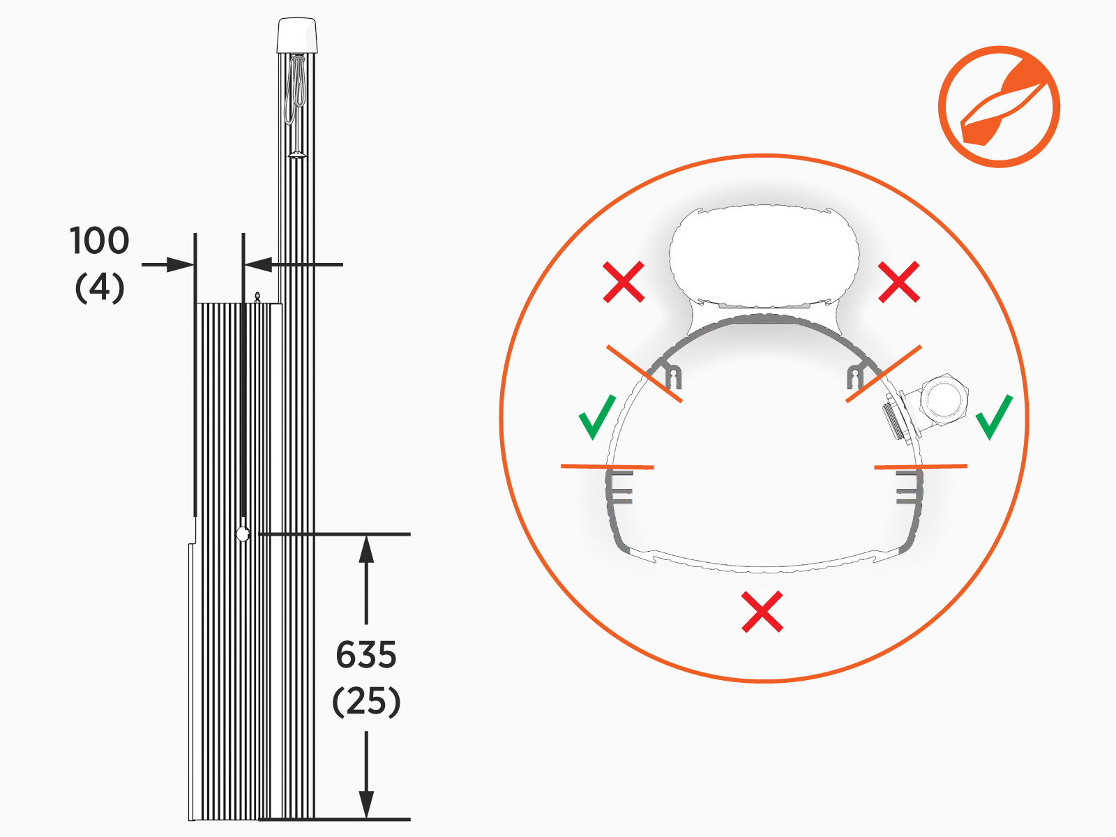 Mark the conduit entry point on either side of the housing. The center of the opening must be 635 mm (25 in) from the bottom and 100 mm (4 in) from the front, a location that does not intersect any internal ribs.