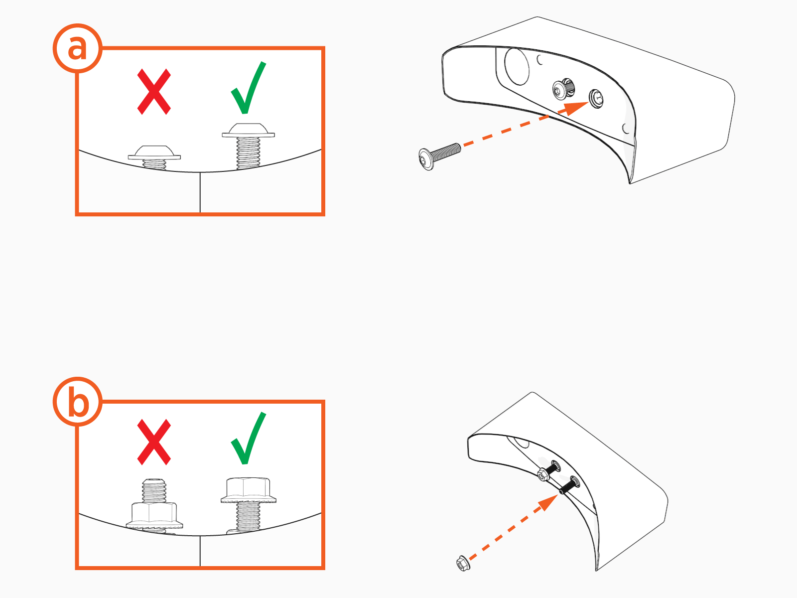 Insert two threaded posts and nuts (b) on the bottom bracket.
