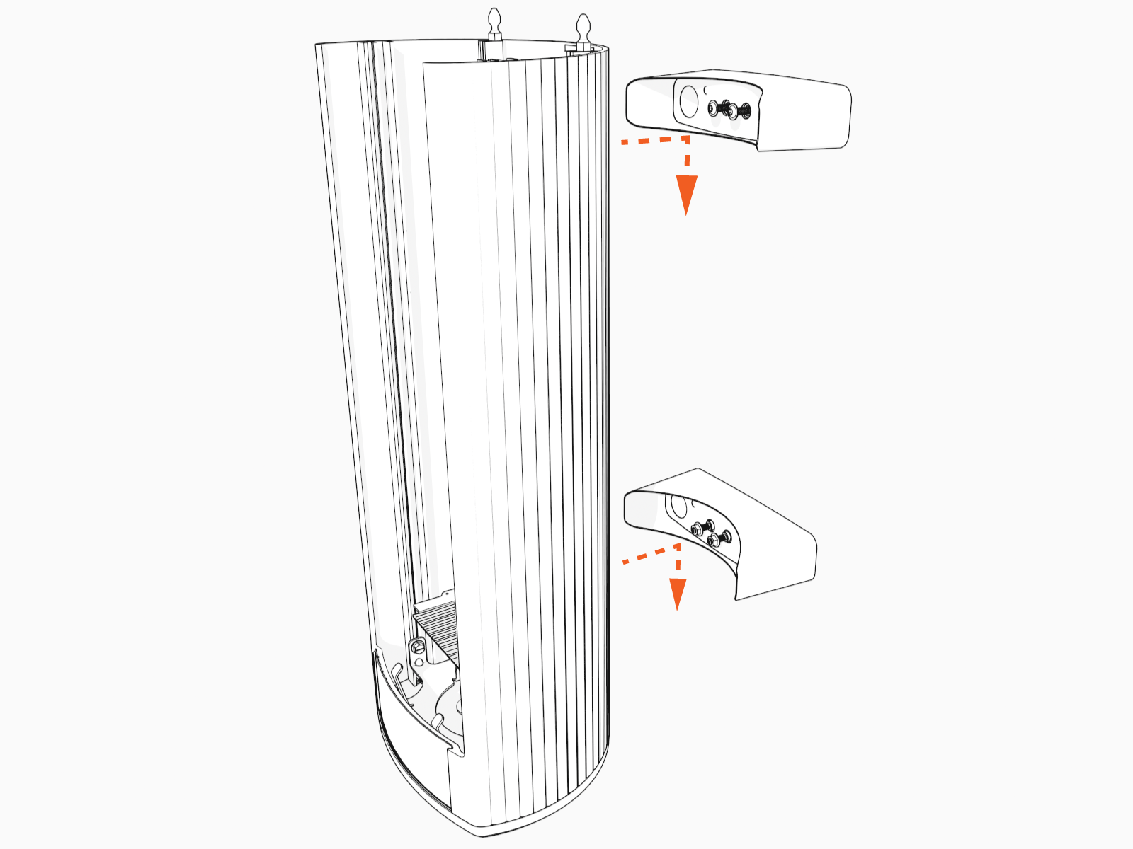 Align the mounting screws (top) and nuts (bottom) and hang the housing.
