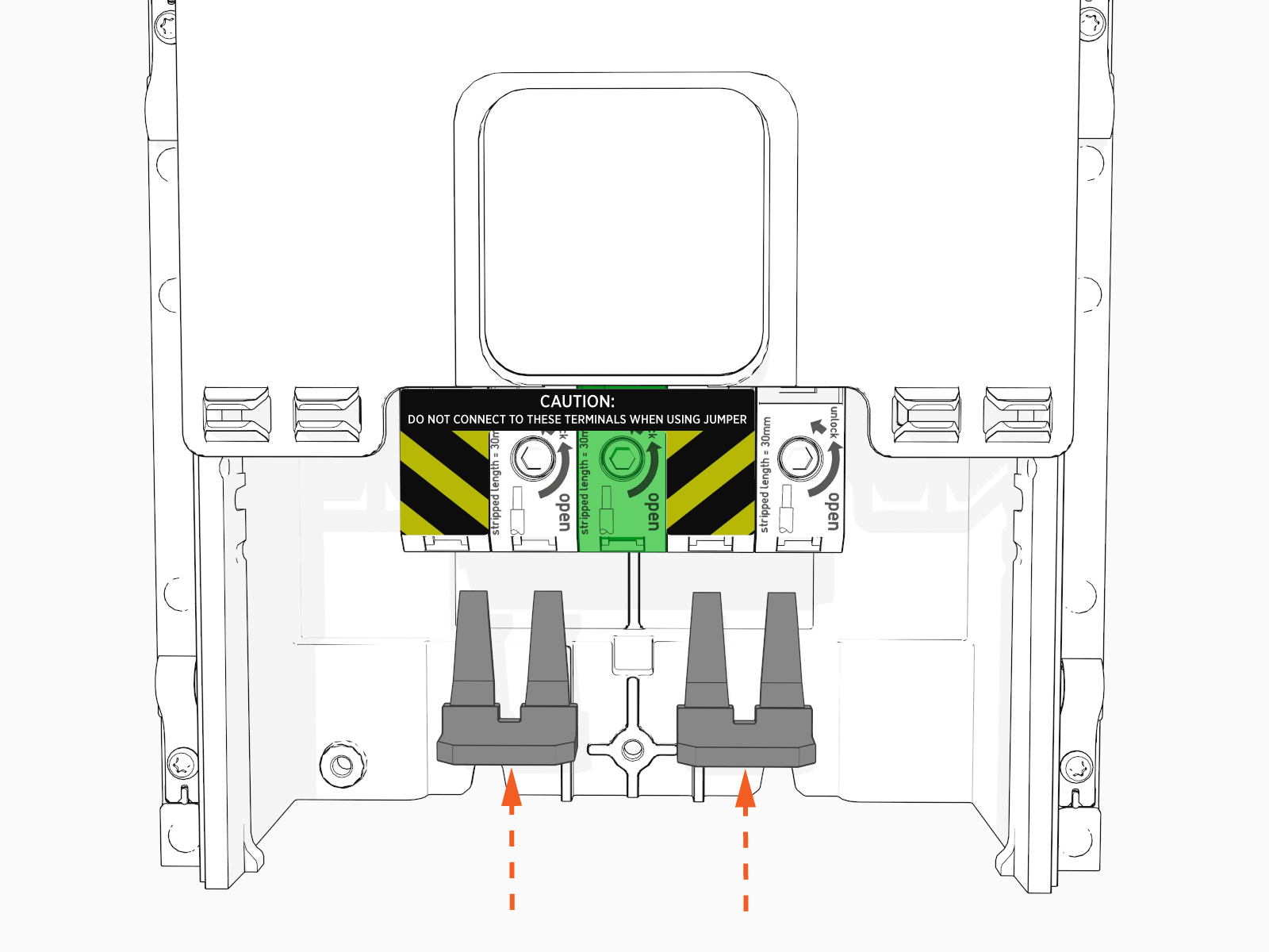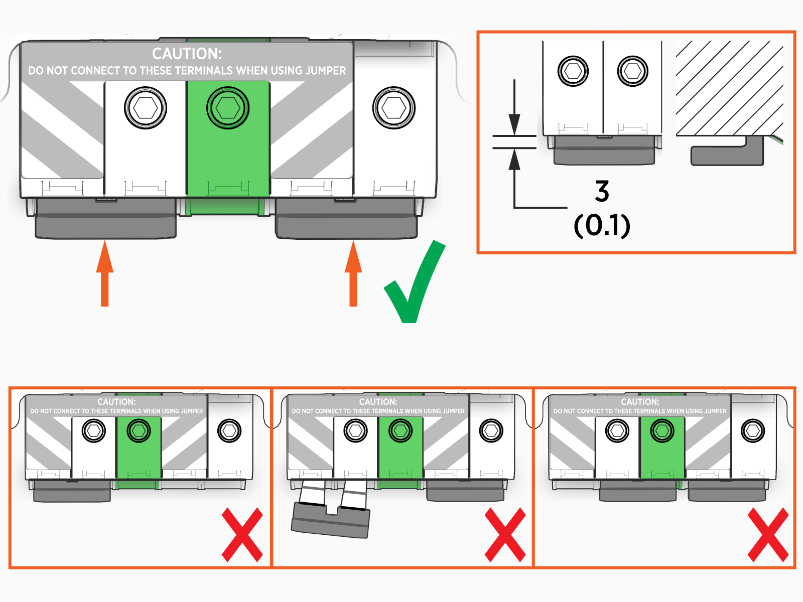 Do not terminate wires on either of the two specific terminals that are being fed by a jumper.