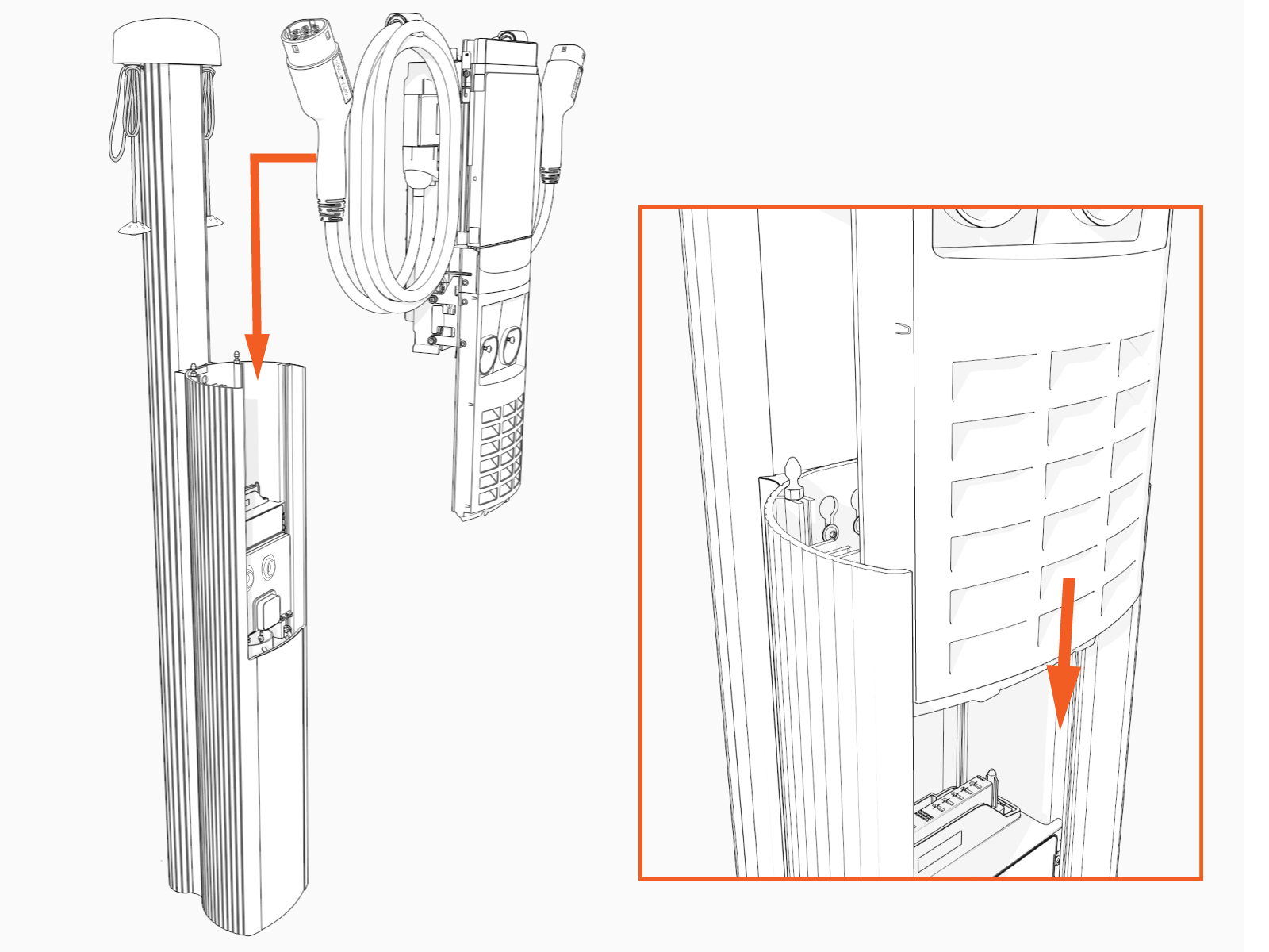 Insert the charging cables into their corresponding holsters.