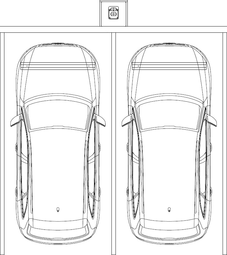 Place two stations back to back centred on four spaces with wheel stops 900 mm from the front of each stall. The base of the charging station can be flush with the parking spaces or at kerb level.