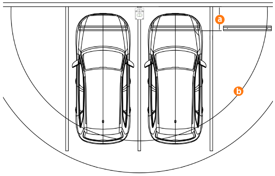 For wall-mounted stations, the wall must be smooth, stable, plumb and sturdy. The minimum height of the wall must be 1250 mm. Place wheel stops (a) 900 mm from the wall. The arc shows the usable reach of the 5.5-m charging cable (b).
