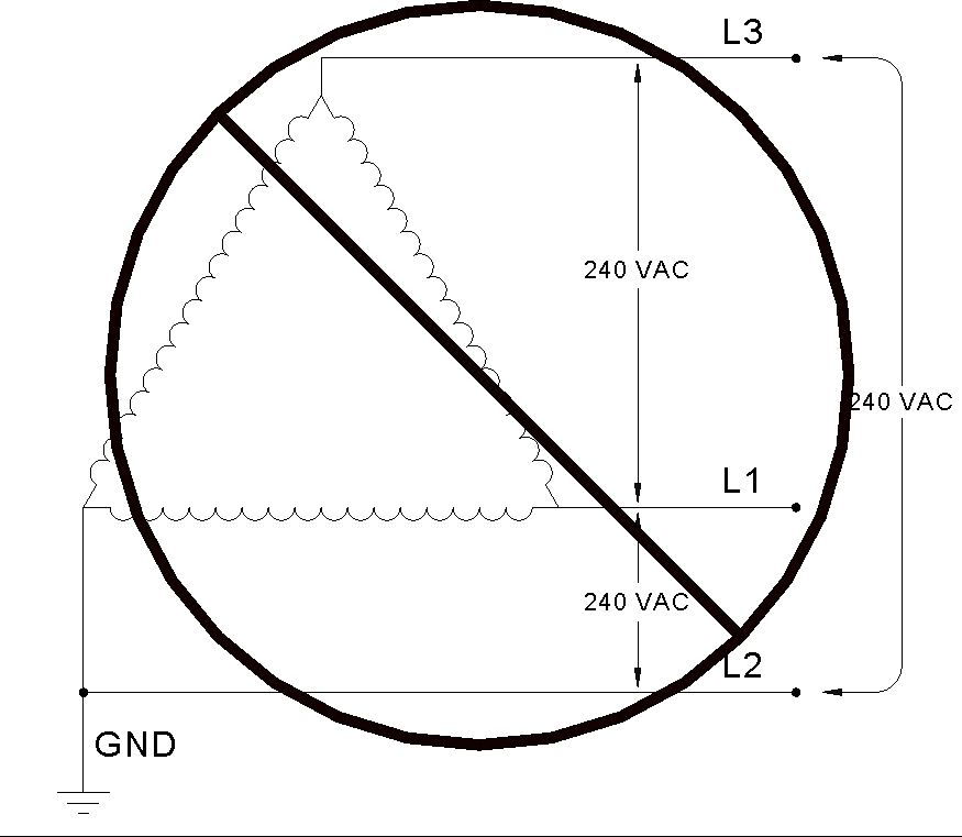 120/240 VAC 3 phase Delta, corner-grounded Voltage of any line is not 120 V nominal relative to ground
