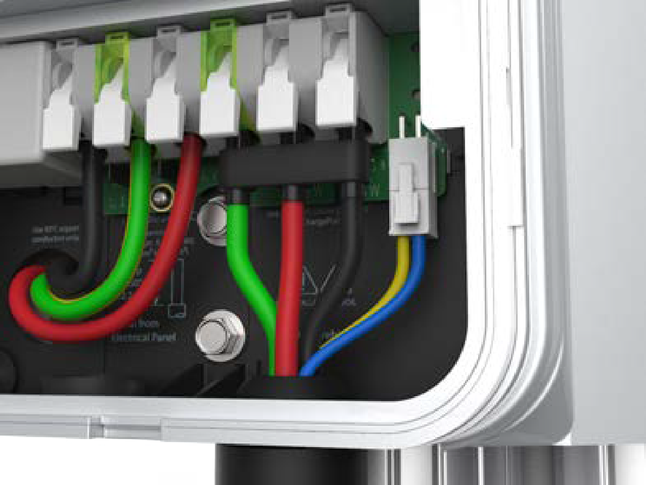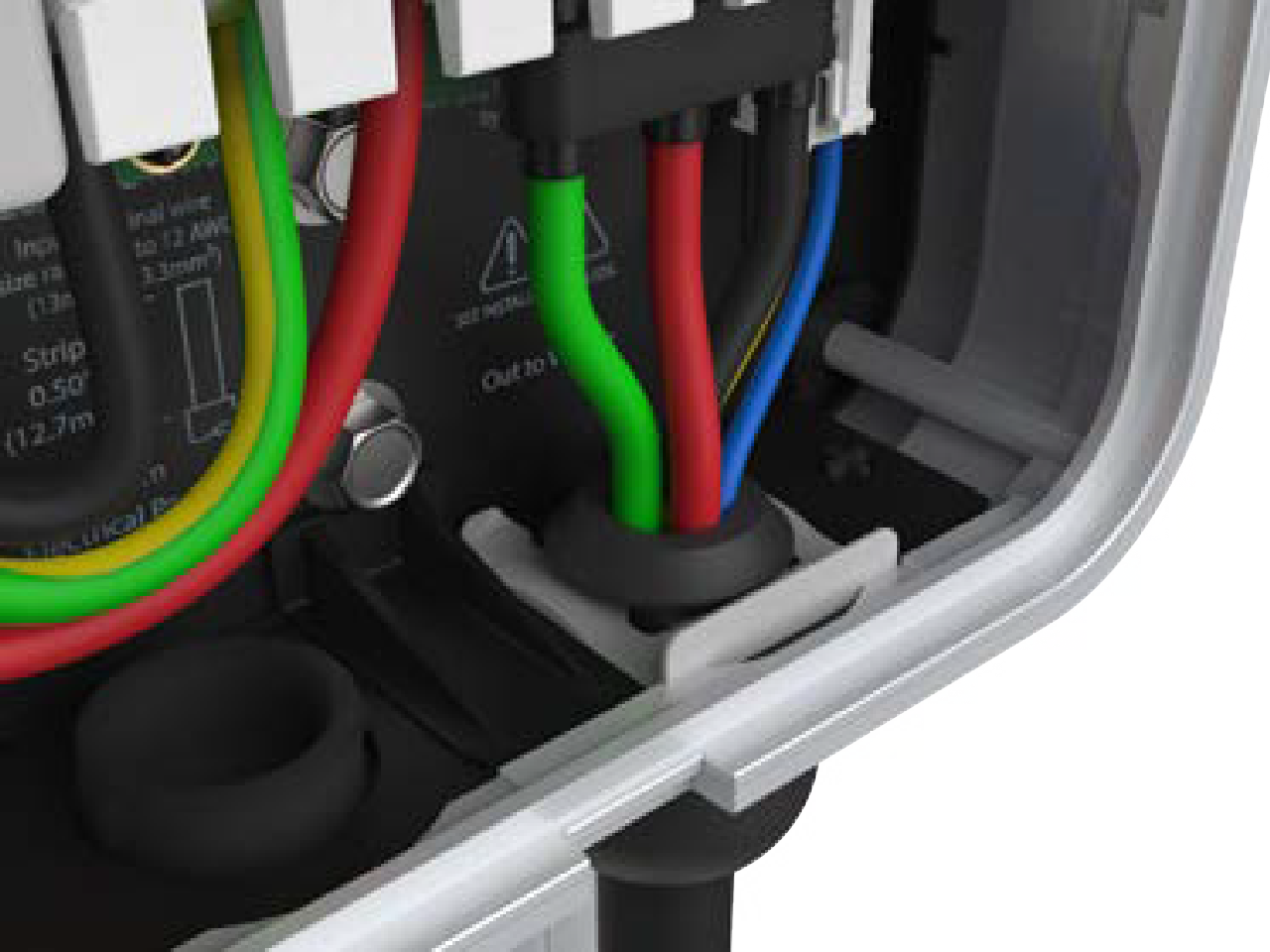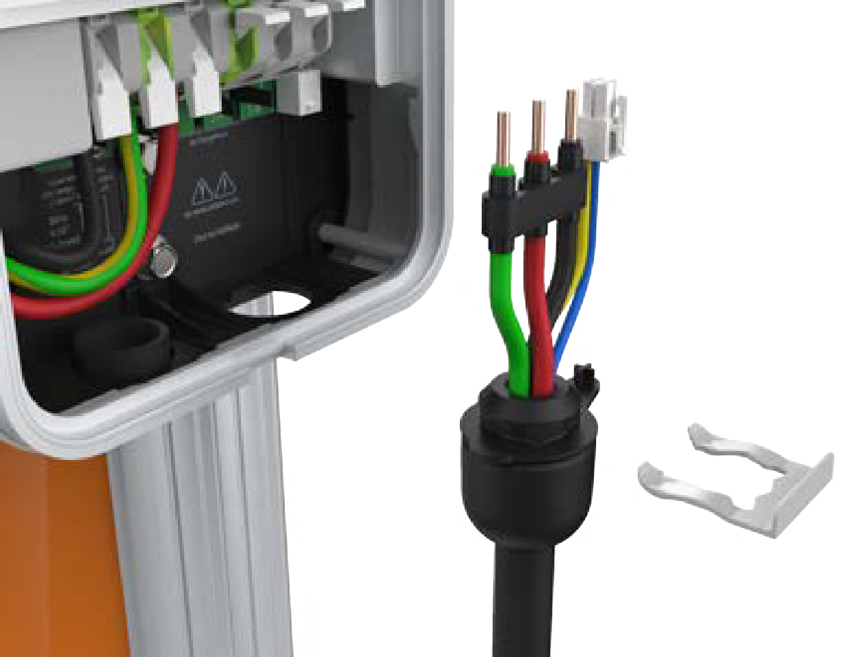 Fold the wire ends and insert them into the opening on the lower right side of the station, pushing up until the cable collar is flush against the enclosure.