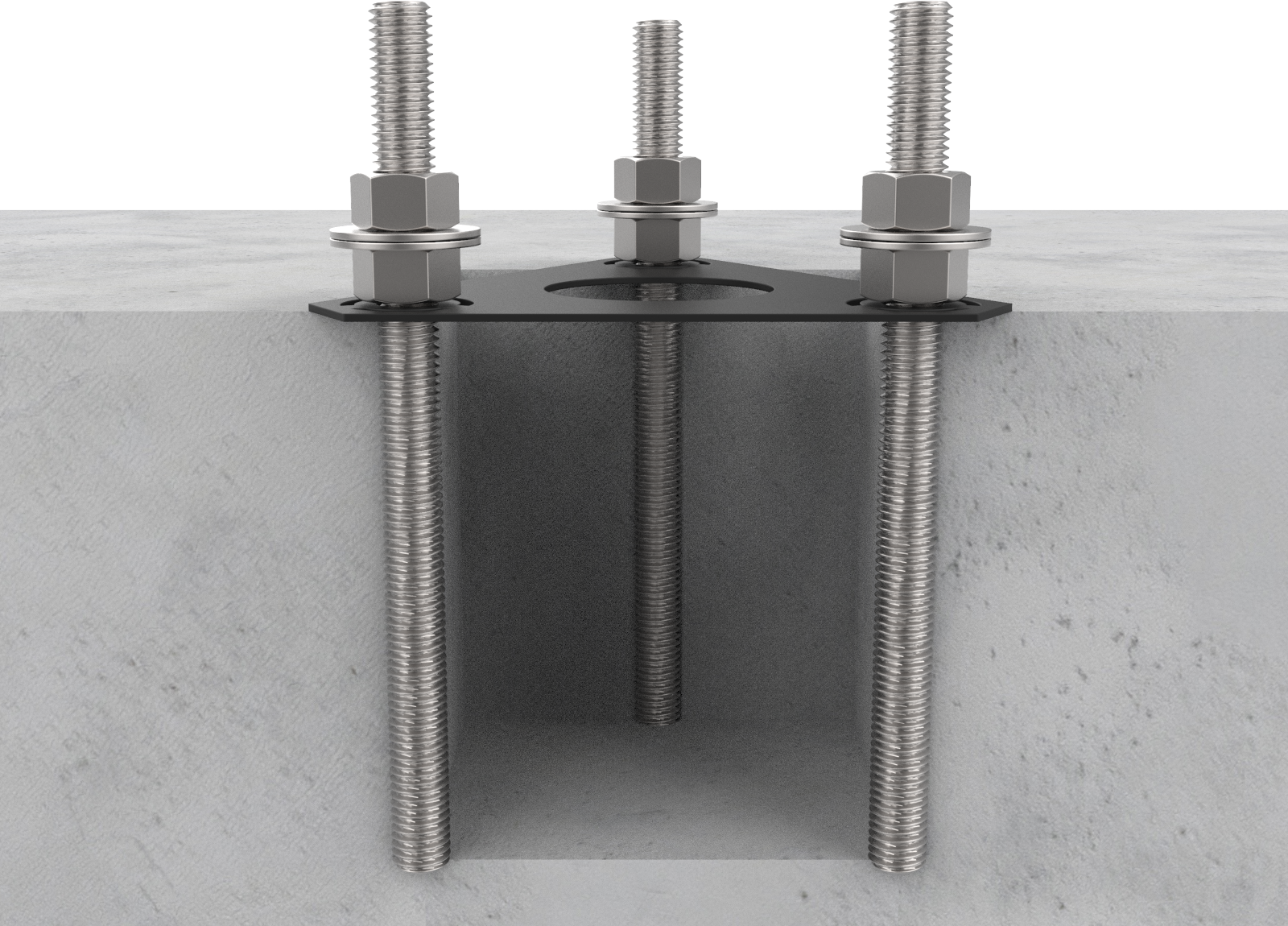 When the concrete is fully set, remove the upper nuts and the washers to install the pedestal’s mounting post.