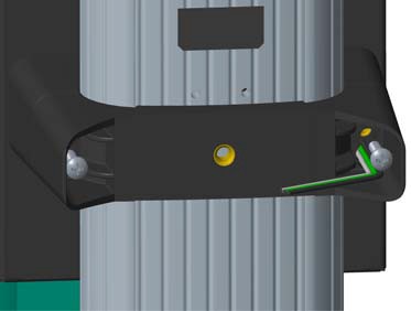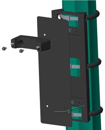 Route the wiring through the hole in the bracket, as shown, then fasten the bracket to the pole using a 9/16” nut driver to tighten two of the 3/8”- 16 x 0.75” flange head screws. Tighten to 20 ft-lbs.
