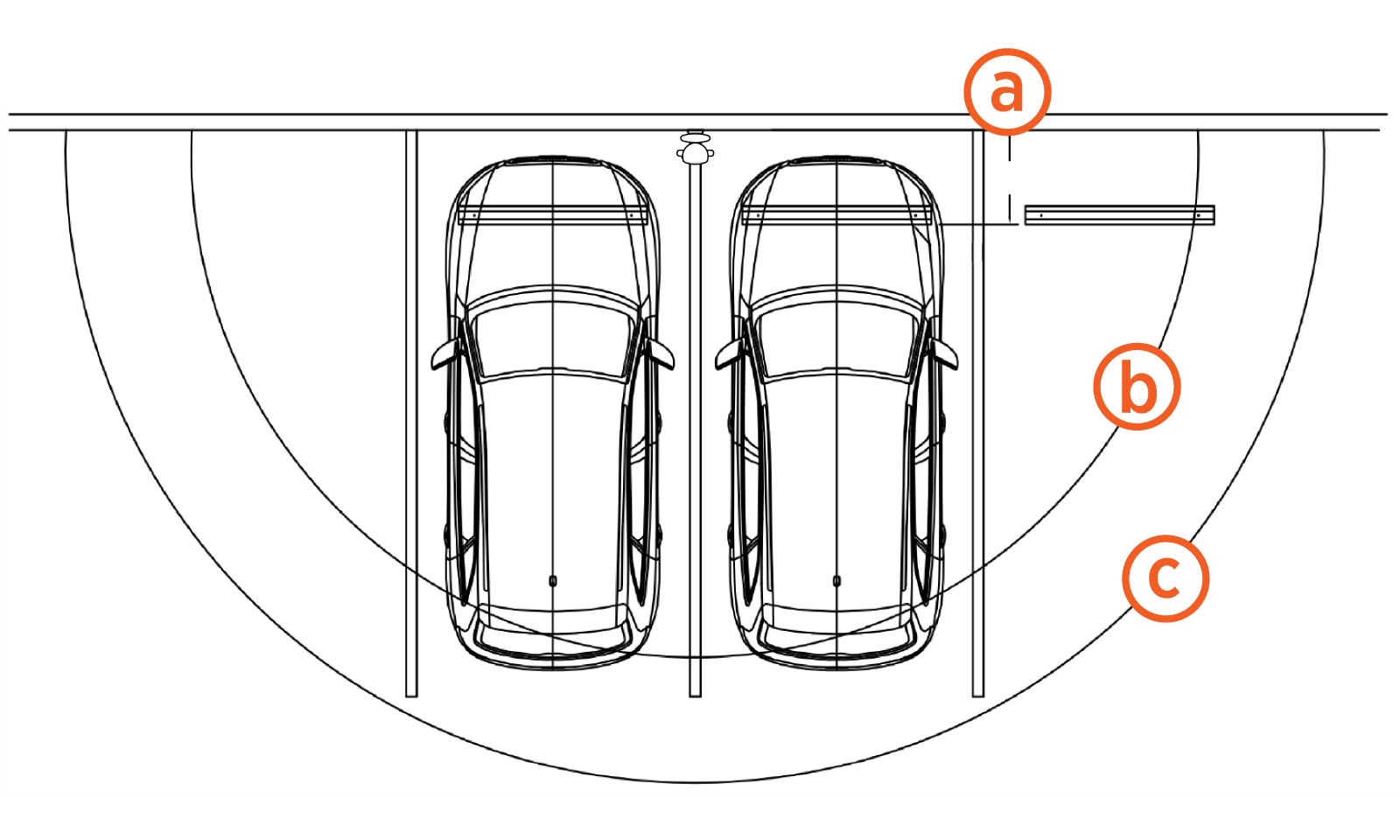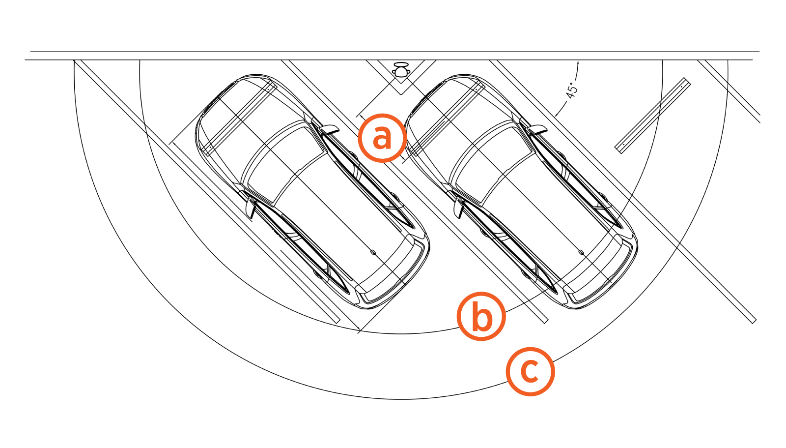 Place a dual holster station centered on the right space. The charging cables reach two vehicles. Place a wheel stop (a) 1220 mm (4 ft) from the center of the charging station. The arc shows the usable reach of the two charging cable lengths available: 5.5 m (18 ft) (b) and 7 m (23 ft) (c). The 7 m (23 ft) cord option is recommended for this configuration. The base of the charging station can be flush with the parking spaces or at curb level. Be sure to install EV