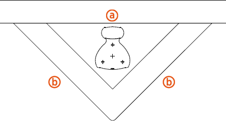 For wall mounted stations, the wall must be smooth, stable, and plumb. The minimum height of the wall must be 1250 mm (49 in). Place wheel stops (a) 90 mm (3 ft) from the wall. The arc shows the usable reach of the two charging cable lengths available, 5.5 m (18 ft) (b) and 7 m (23 ft) (c).