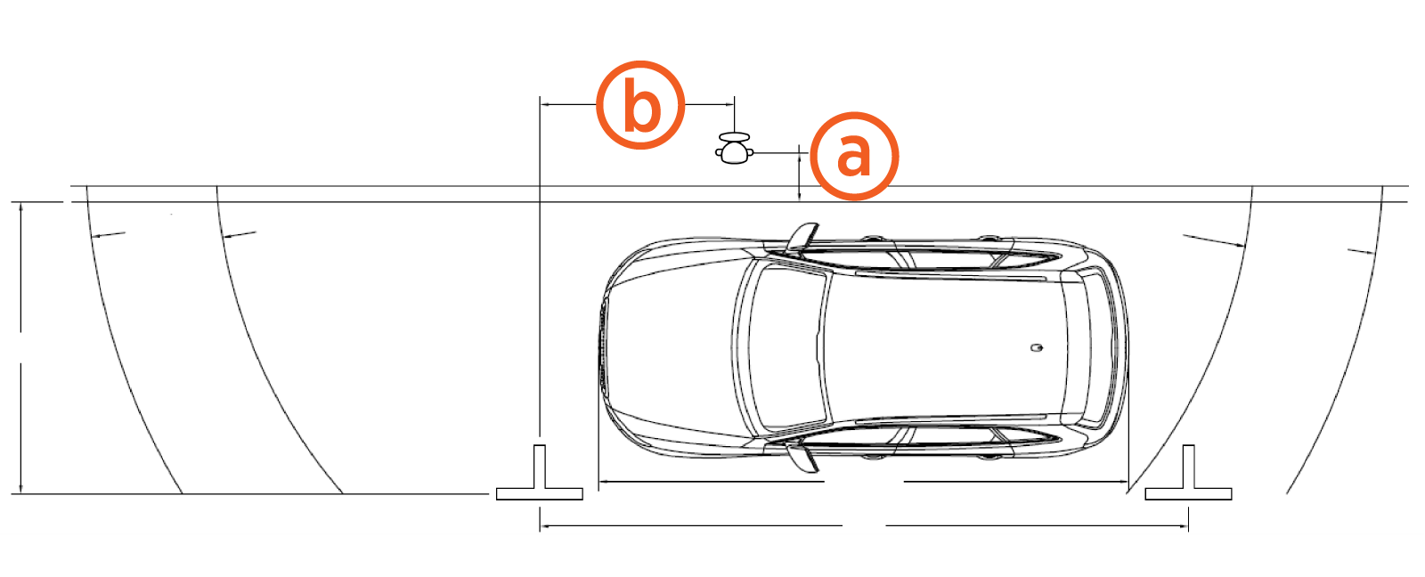 Place the station in a planter or berm between spaces with wheel stops 900 mm (3 ft) from the front of each stall (a).