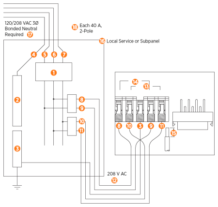 National Electric Code) requirements. (For other regions, refer to local code.) This means that for a maximum 32 A load at 208/240 V output to an electric vehicle, 40 A breakers are required.