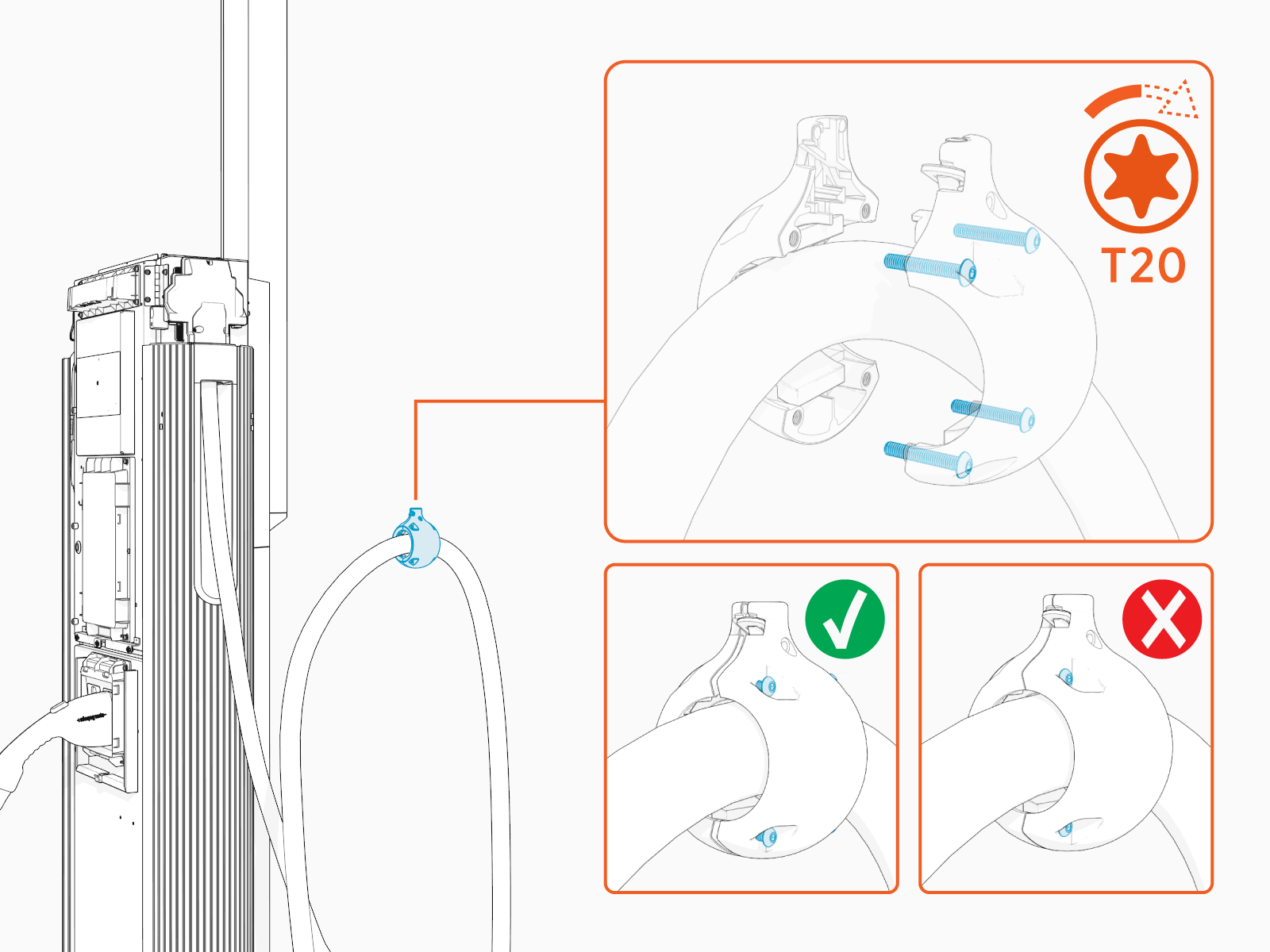 Standard length (5.8 m or 19 ft) charging cables come with a tetherball preinstalled onto the cable. For non‑LCC