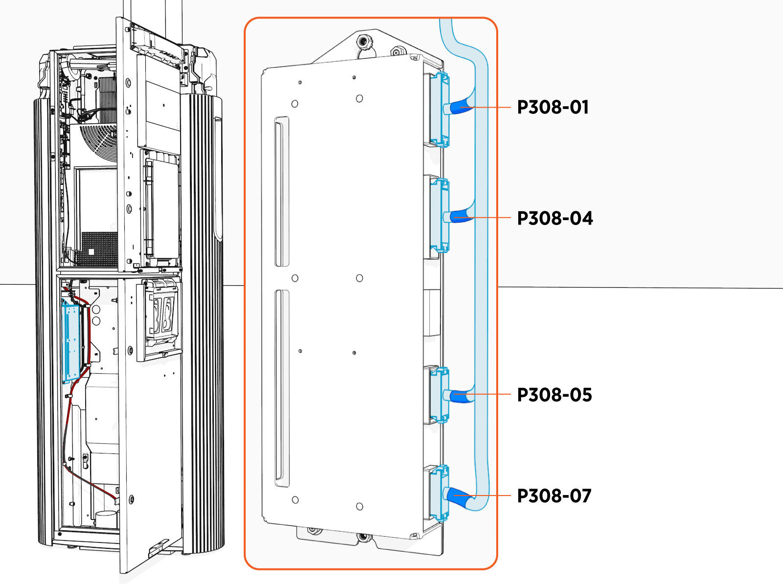 Pin B1 on the P308-04 connector (on the CCB) to red wire 48 V on the fan tray 2 connector.