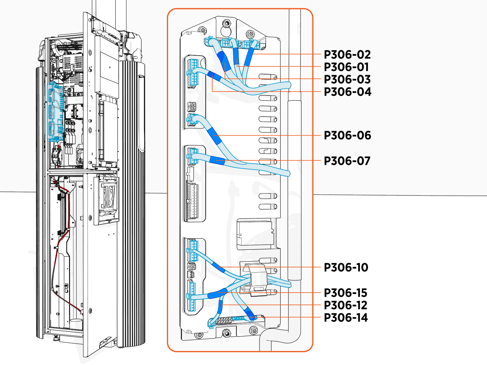 Check if the wires 1 and 2 on P306-10 are pulled out of the connector with a basic pull test.