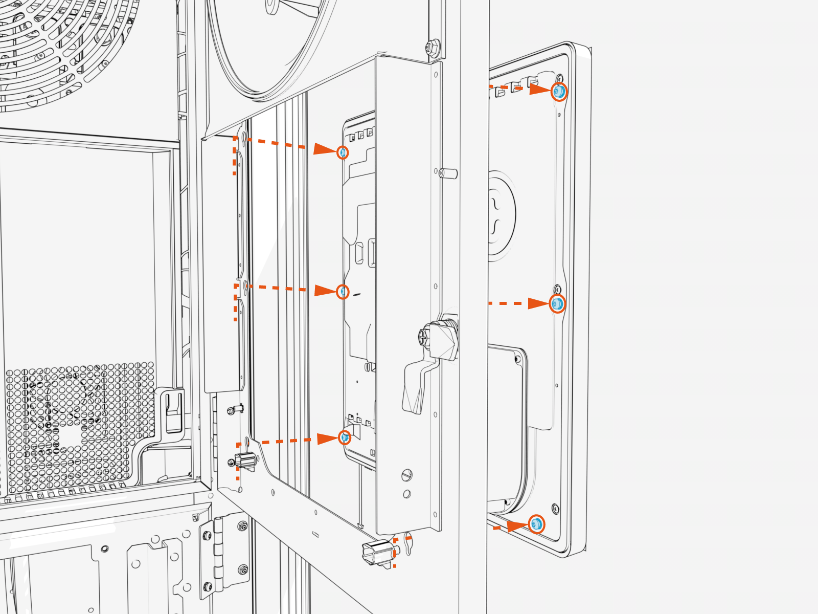 Align the replacement door (with larger opening for 15-inch display) to the Power Link 2000 frame and secure it with M5 screws (x4) at the door hinges. Torque to 4.5 Nm (40 in-lb).