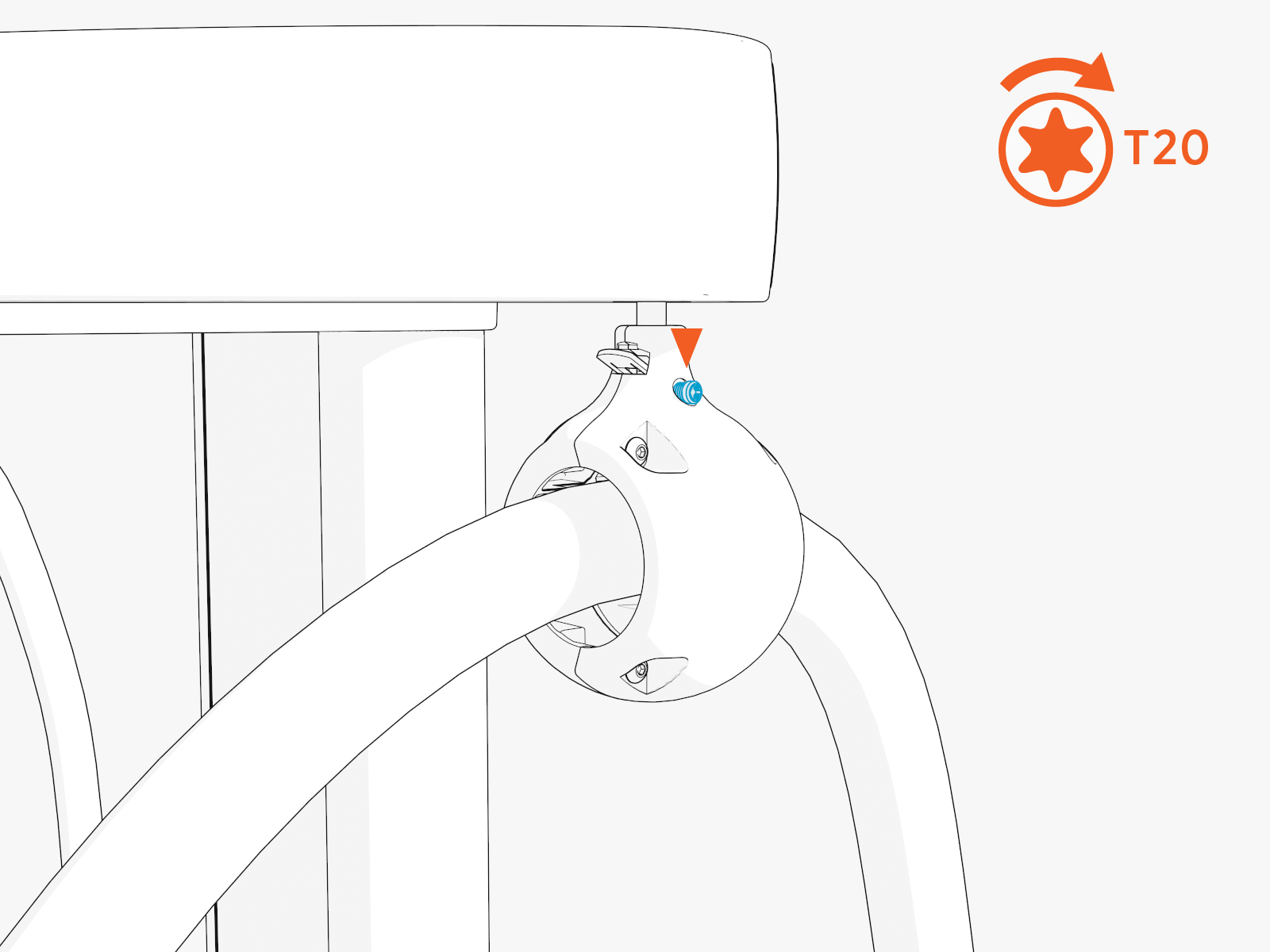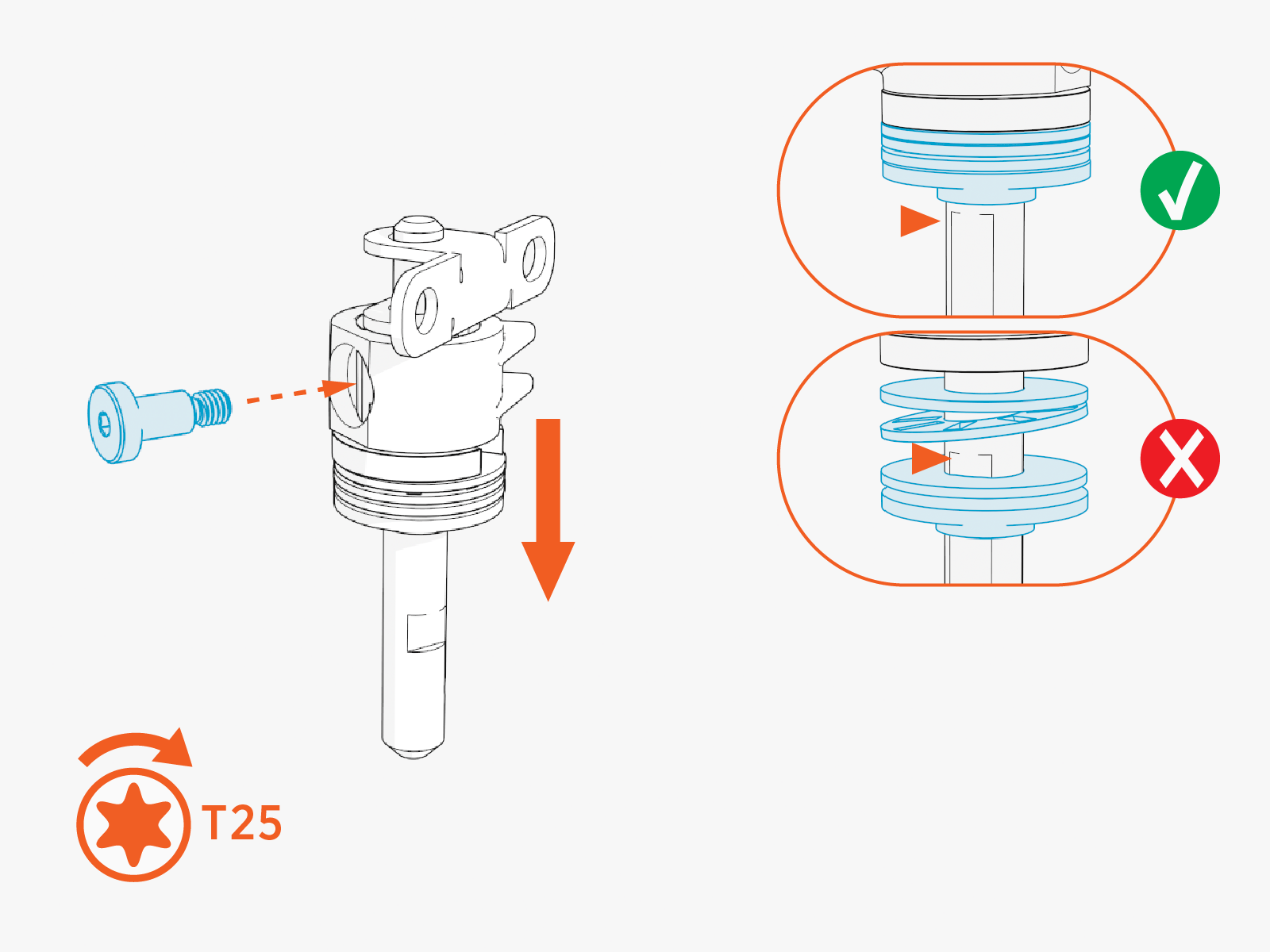 Reinstall the tether hat, rubber stop, T25 Torx screw, and tether shaft retainer. Hand tighten the screw.