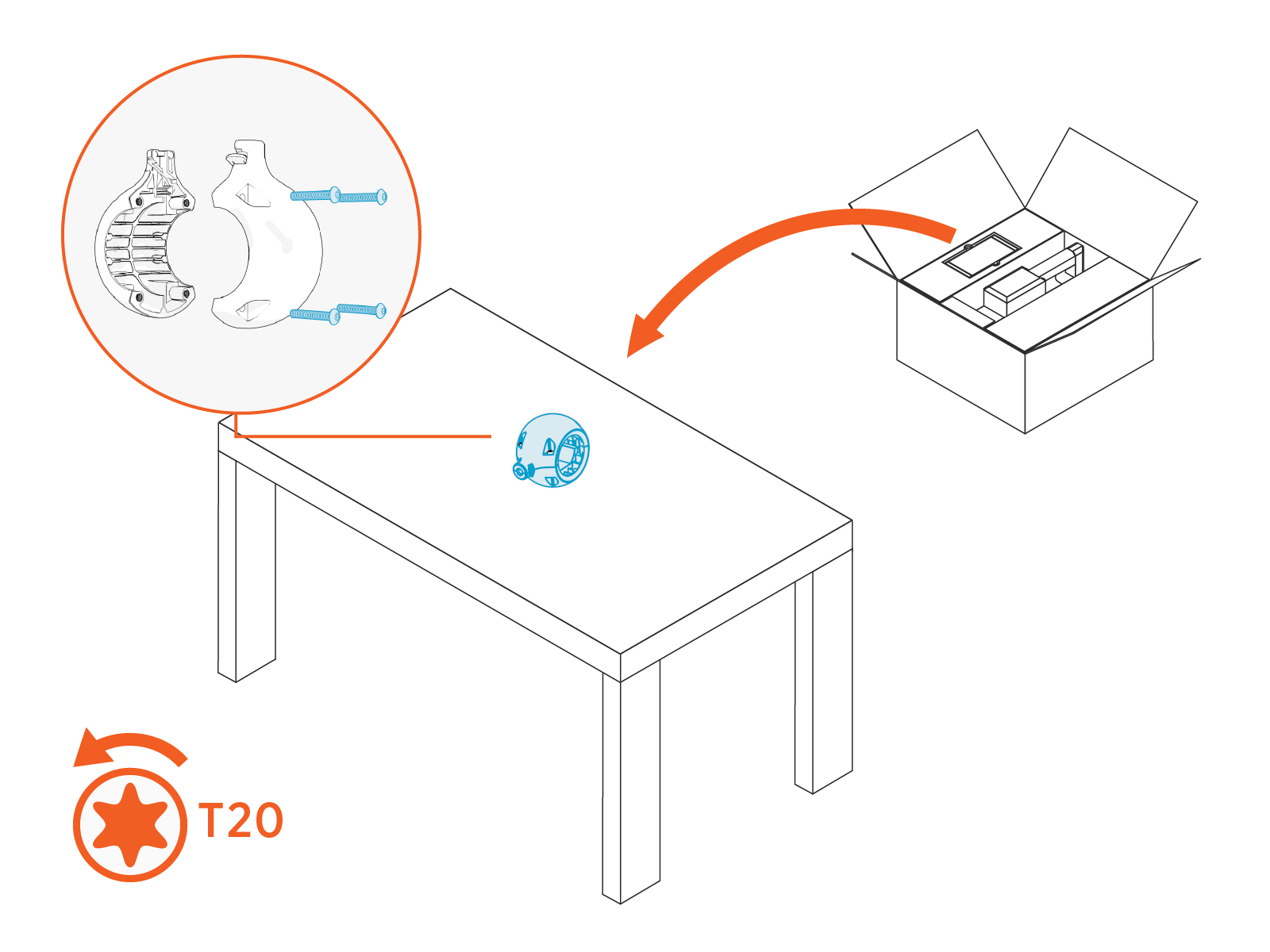 For uninstalled tetherballs, unpack all tetherballs from their associated charging cable shipping boxes. Unassemble each tetherball by removing T20 Torx screws (x4).