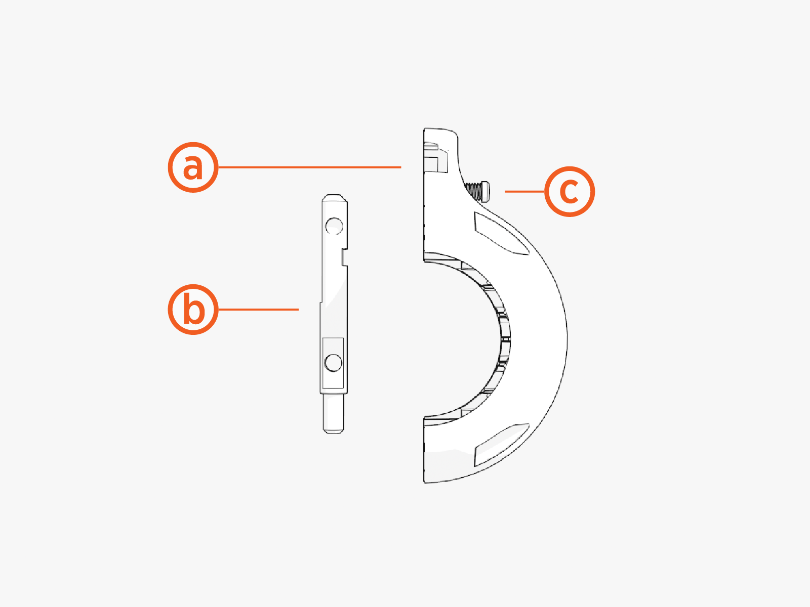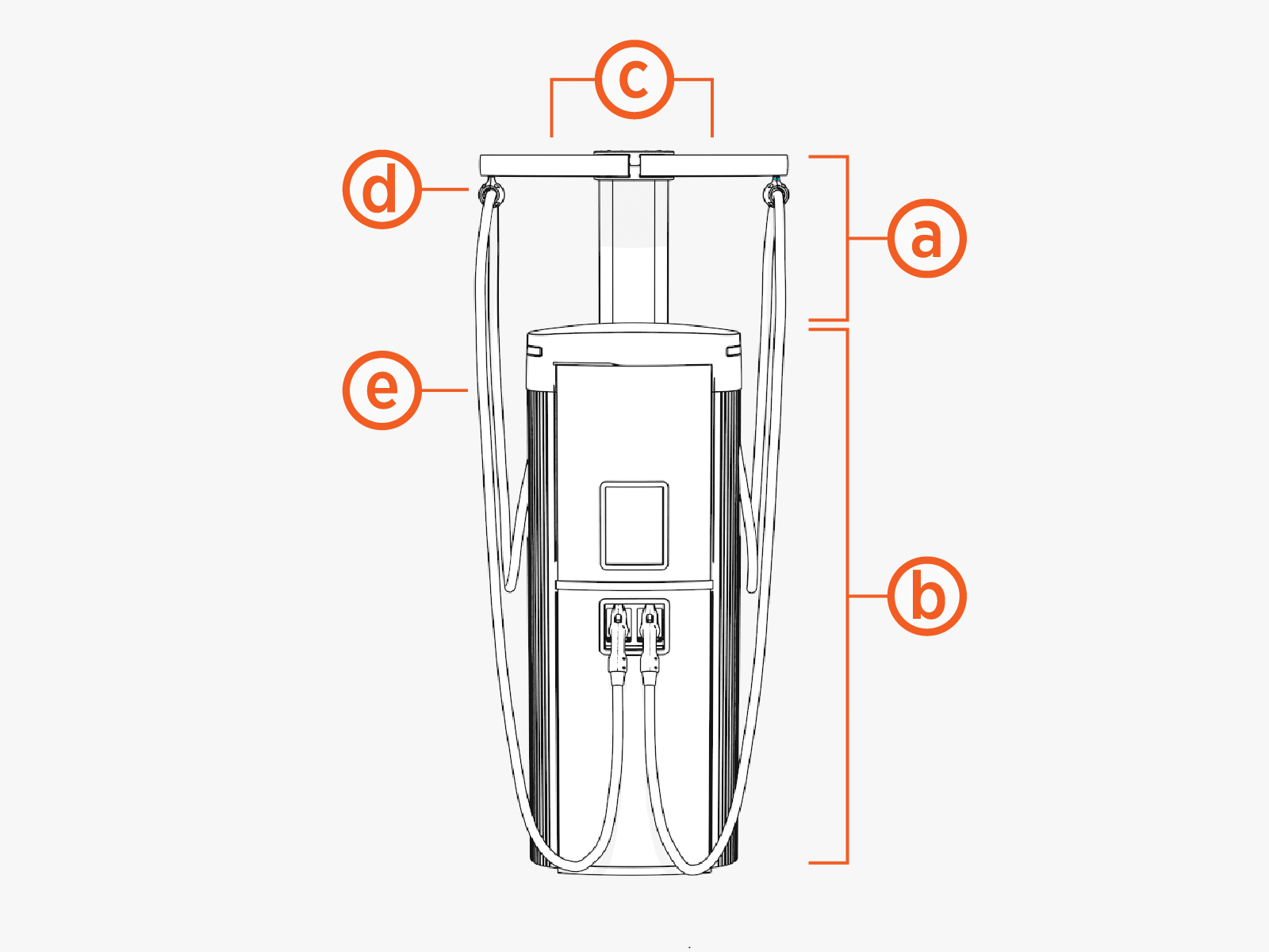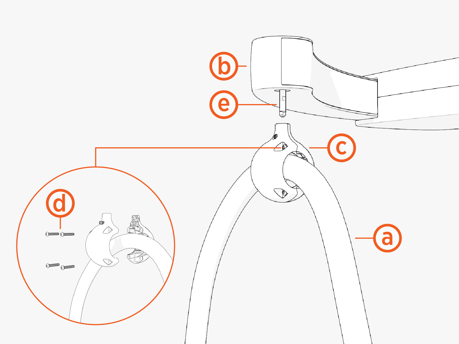 Cable Management Kit swing arm (b) through the use of a tetherball (c). The tetherball is made of two halves that clamp onto a charging cable, secured by four T20 Torx screws (d). The top of the tetherball installs onto a tether shaft (e) on the CMK