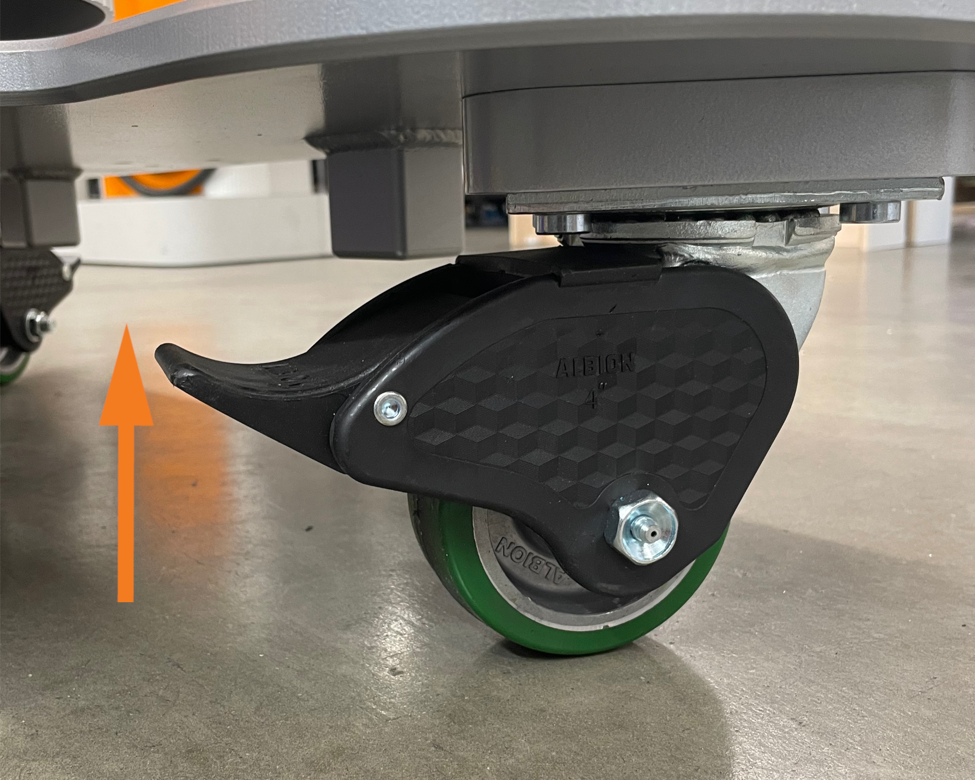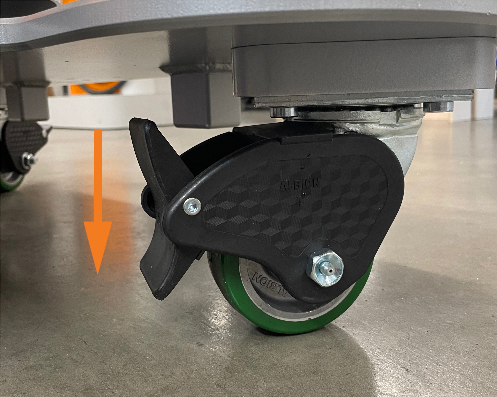 Unlock the front casters. The lever is locked in the down position, unlocked in the up position.