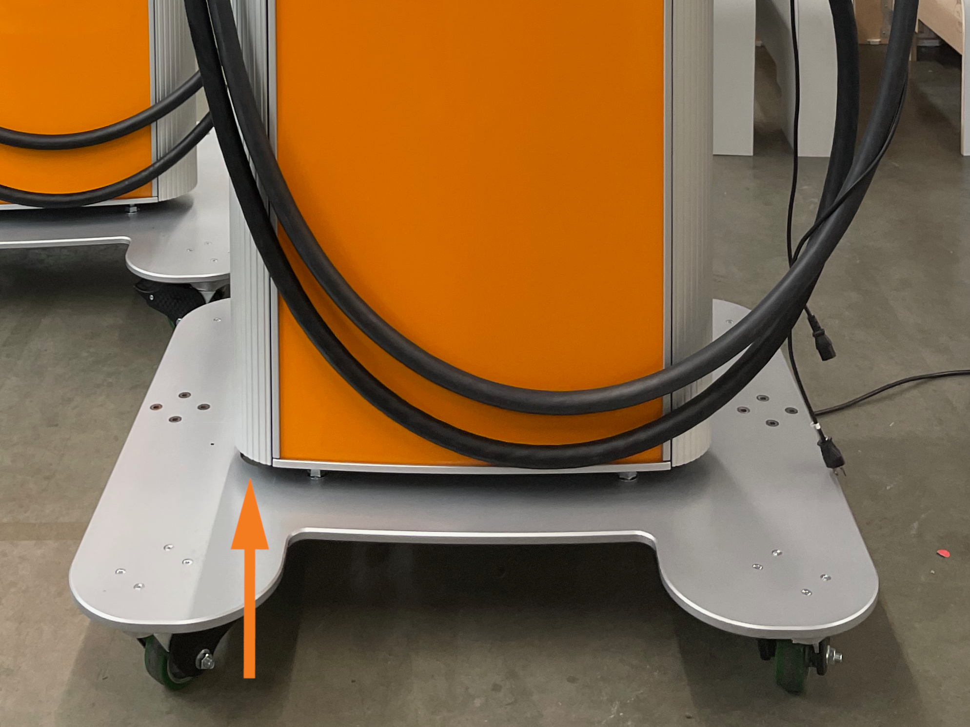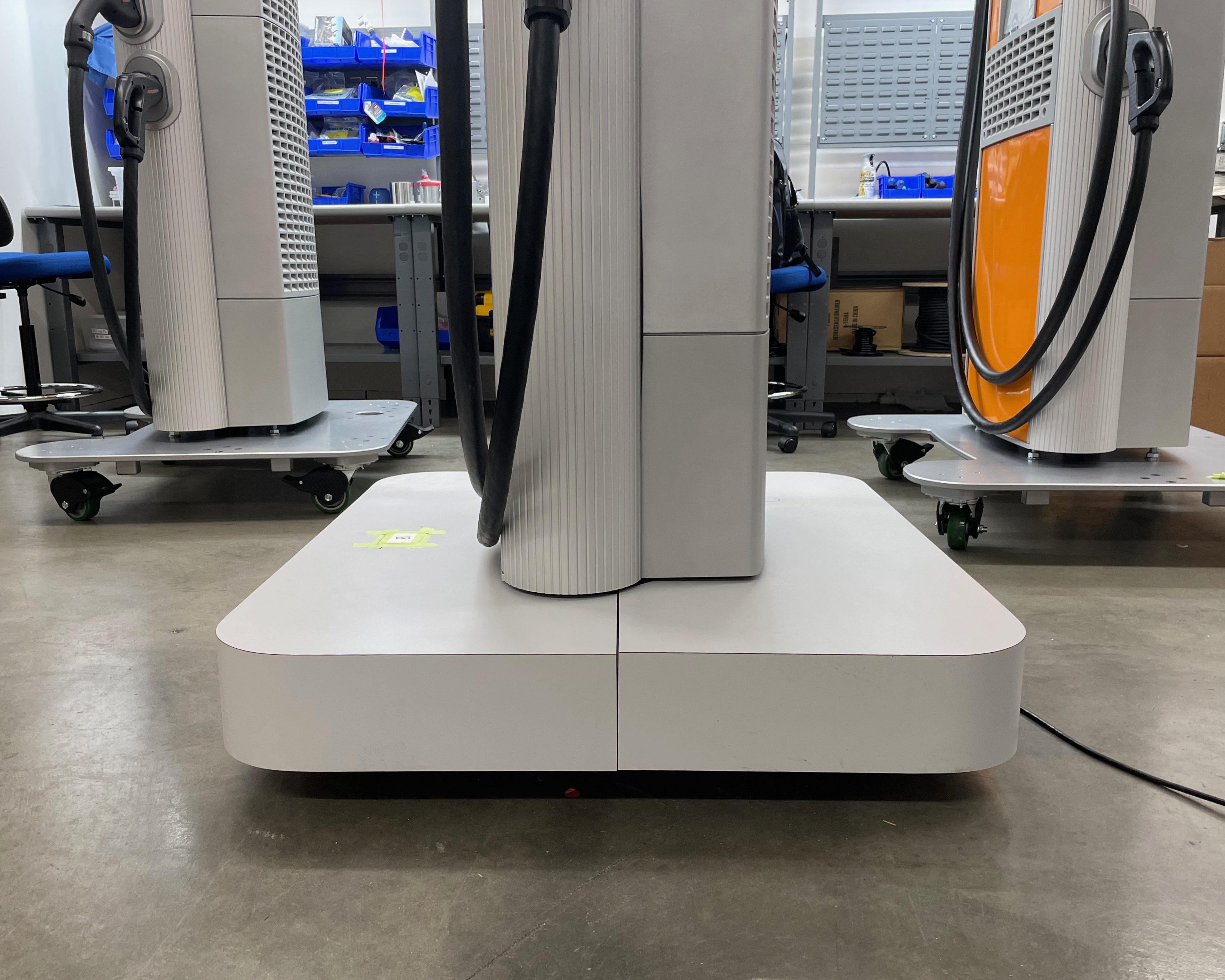 Remove all protective covers from the station (charge cable connectors, cables, and swing arms) and set them aside for reuse. The charge cables are wrapped around the station.