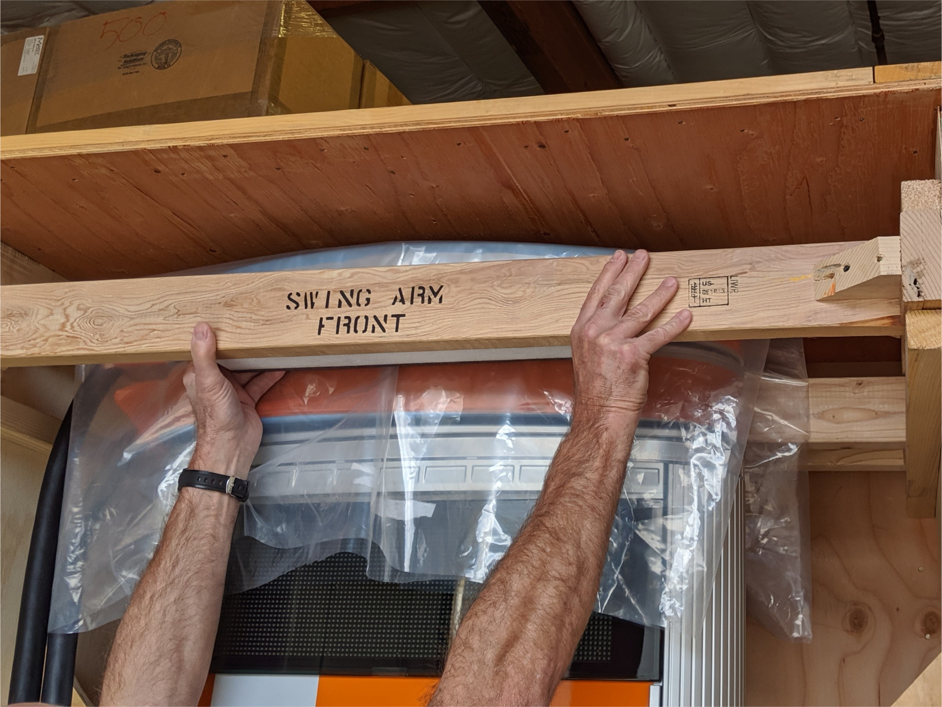 Remove the upper swing arm retainer from the crate and set it aside.