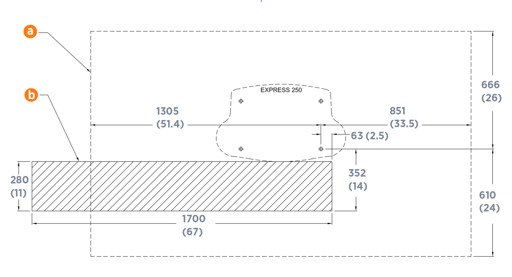 Before beginning work, check that the site meets these civil and mechanical requirements outlined below, as illustrated in the following image. Measurements are in mm (in):