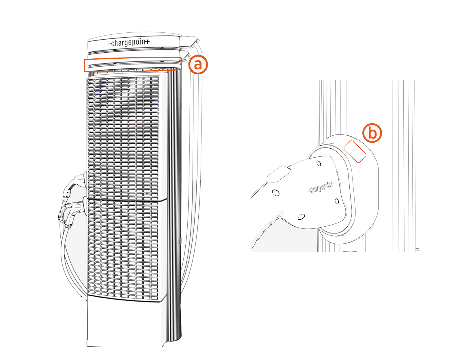 When installing a Express 250 with Power Select, additional sets of labels must be ordered with a Express 250 station. When ordering a set of labels, it will include one label to be applied below the cable swing arms (a) and one label to be applied on the charging cable holster (b).
