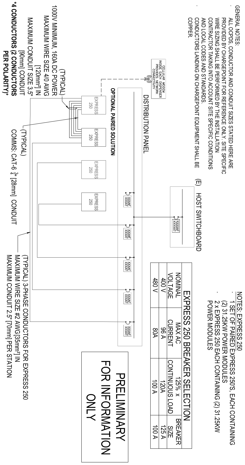 The Express 250 charging stations in North America are available with a maximum amperage of up to 80 A. The default installation requires service wiring to be installed underground. (If a site requires surface mounting, refer to Install the Surface Mount Plate for instructions on installing the station using a surface mount plate.) Conduit and wire size are determined based on the length of runs from the electrical panel to the station location. Service wiring must be run through conduit or ducting, or use armored cable, as required to comply with local electrical codes. Consult national and local codes or a project engineer to determine the grade, quality, and size of the conduit or cable. The ChargePoint Concrete Mounting Template (CMT) accommodates service wiring through the flare, conduit, or locally appropriate wiring method.