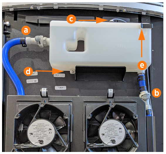 Gently slide the coolant reservoir to the left and up, to release it from the right side bracket (e) and its shelf.