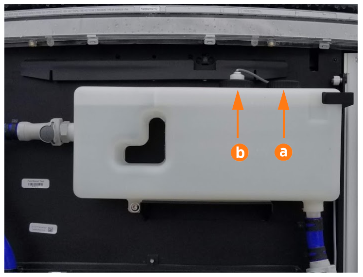 Using a step ladder if needed, unscrew the reservoir fill cap (a).