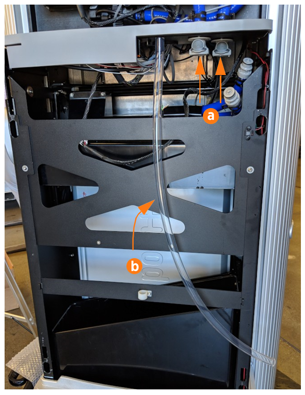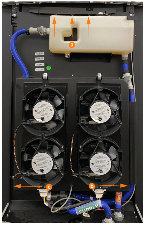 For each of the two coolant lines (a), push the button on the Quick Connect at the bottom of the heat exchanger assembly and pull to disconnect the coolant line from the heat exchanger assembly.
