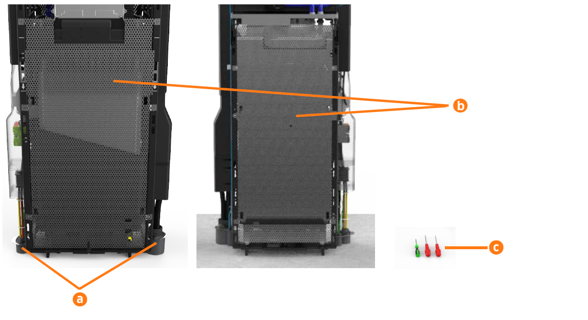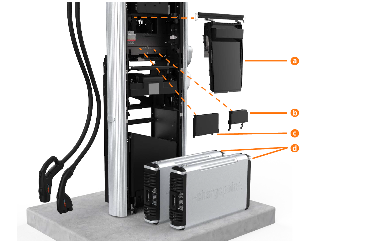 This topic shows the names and locations of all Field Replaceable Units (FRUs) on the Express 250 charging station that can be serviced in the field by a trained and approved third party.