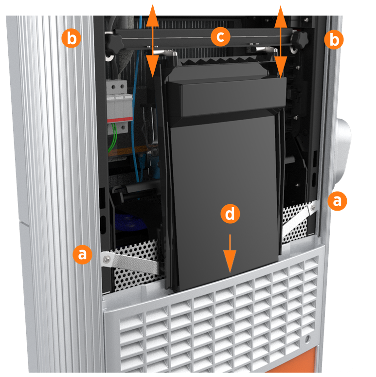 With hand pressure, swing the touchscreen down. Loosen both retention knobs (b), allowing the touchscreen beam (c) to slide up vertically. Re-tighten the knobs at the highest position. Tilt the bottom of the touchscreen inside the slot in the middle vent panel, aligning the notch in the center of the bottom edge (d) to the guide ridge inside the panel slot.