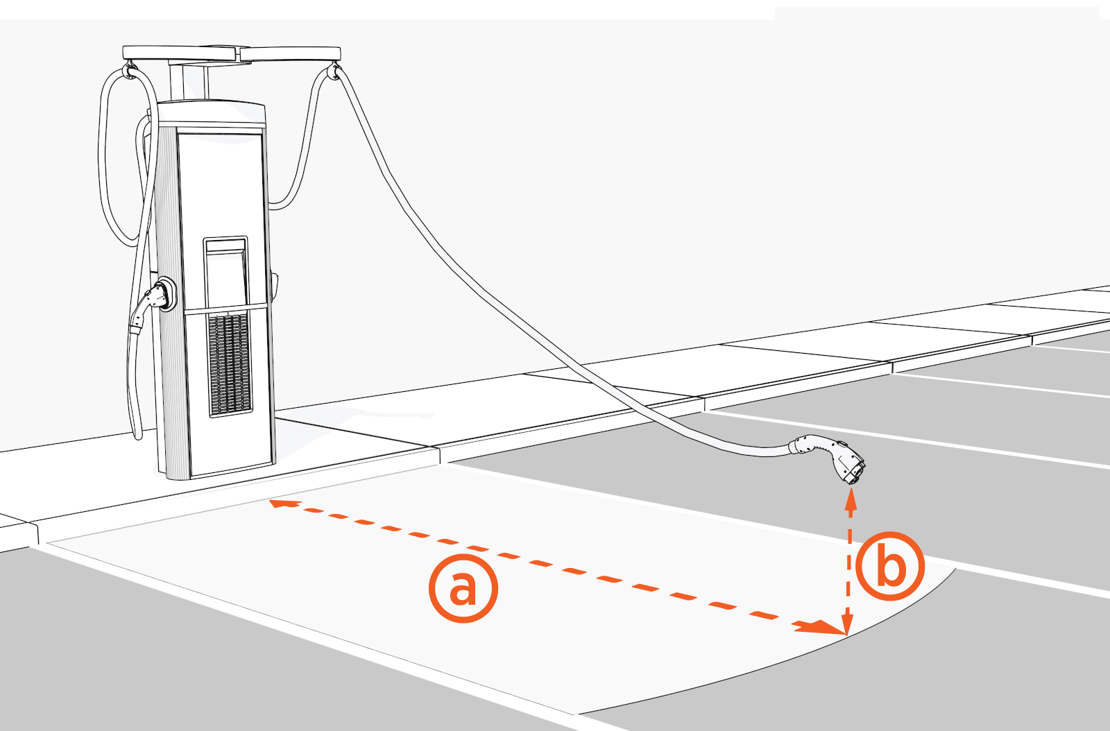 The maximum reach from the station to charge port on a typical vehicle is approximately 3.76 m (12 ft 4 in) (a) at a height of 0.6 m (2 ft) (b) above the ground.